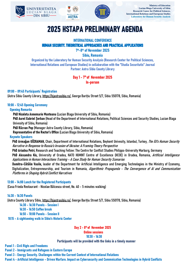 - We remind you that the deadline for submitting the articles proposals for publishing in the “Studia Securitatis” Journal is November 14, 2025; the proposals will be sent journal.studiasecuritatis@ulbsibiu.ro. Only the proposals that meet the criteria will be sent to the peer review process; please see the details: Publication – HSTAPA Conference; also you can access the Studia Securitatis Journal` official site (please download the template): https://magazines.ulbsibiu.ro/studiasecuritatis/recommendations/